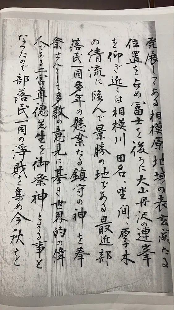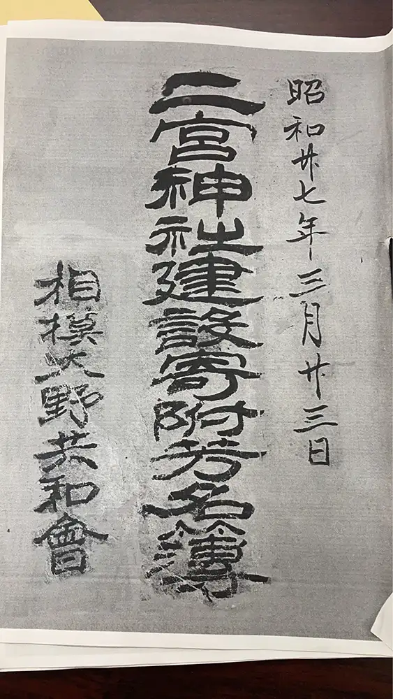 昭和24年二宮尊徳翁の「報徳の精神」(至誠・勤労・分度・推譲)の教えを地域に広めようと、正木造酒蔵氏を中心とする相模大野駅周辺の地元有志の方々による報徳二宮神社御奉斎の機運が高まり、神奈川県小田原市に鎮座する報徳二宮神社より御分霊を戴き、お社を造営する運びとなり、その後地域の発展と安全を願う多くの参詣者が訪れることとなり、昭和50年8月には御社殿の大造営が計画されました。